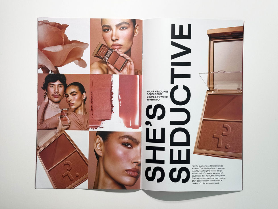 Art direction and design for a blush launch where each of the four bold shades inspired its own tonal world—from makeup to wardrobe to set design. The campaign included model and product editorials, outdoor advertising, and a collectible printed magazine designed for PR distribution.